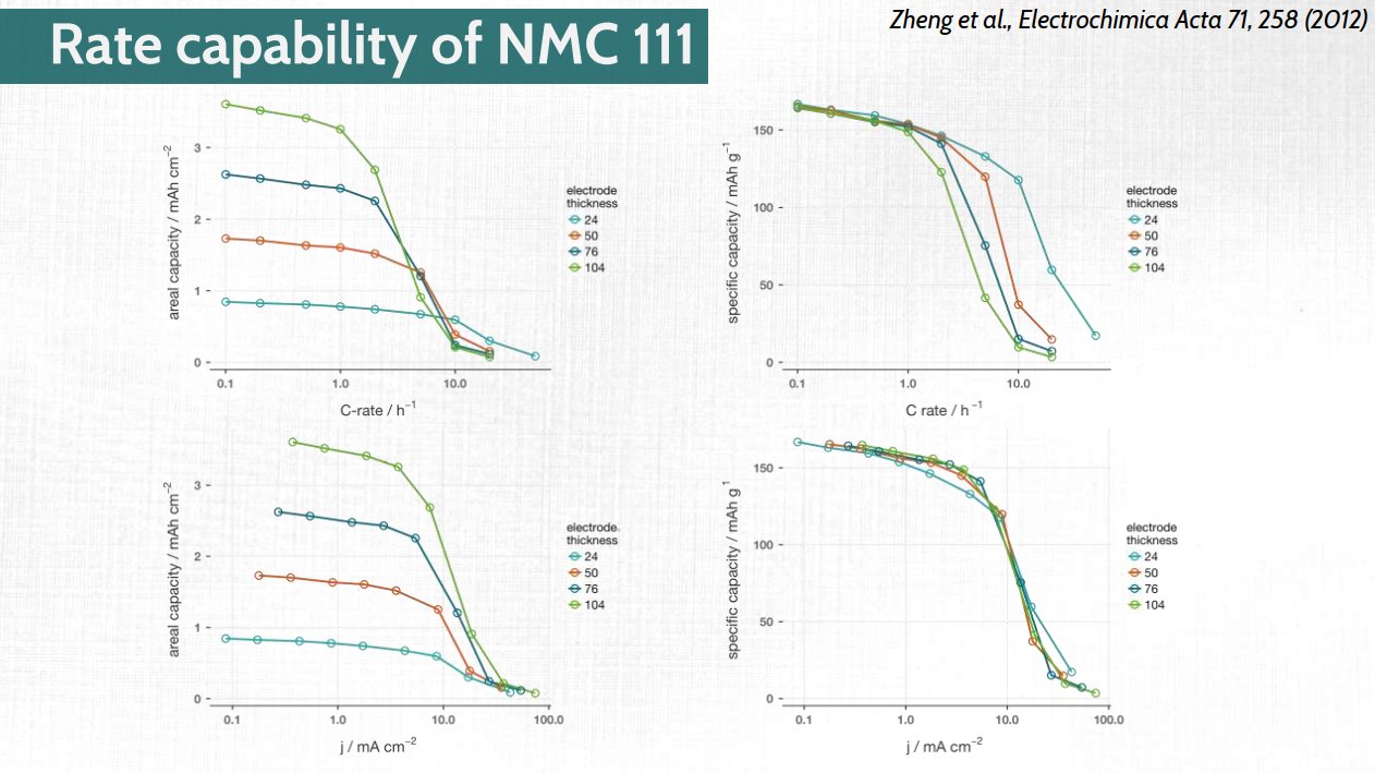 Part of the ignorance lies, I think, in choice of data presentation. In that same presentation, I had this slide. Look at the bottom right: capacity vs current density curves overlap almost perfectly for a large range in electrode thicknesses.